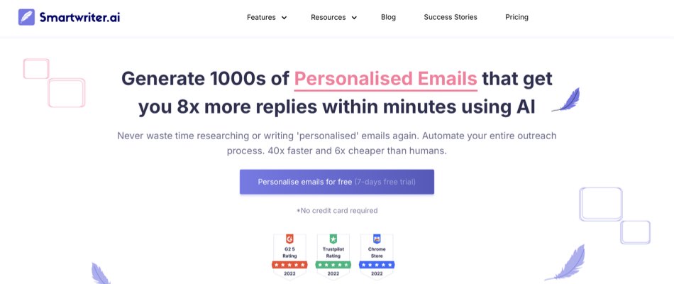 Smartwriter AI, saatte bin kişiselleştirilmiş e-posta göndermenizi sağlar. Yanıt oranlarını artırmaya yardımcı olan vurucu mesajlar oluşturmak için potansiyel müşterilerinizin çevrimiçi verilerini kullanır. Makalelerden, podcast’lerden, röportajlardan ve daha fazlasından elde edilen kaynaklara dayalı olarak tüm araştırma ve metin yazarlığı sürecini otomatikleştirir.