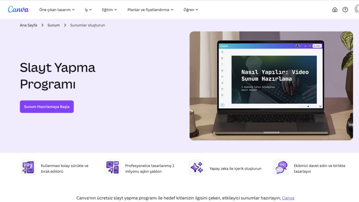 Canva sunum hazırlama aracı, kullanıcı dostu ve gezinmesi kolay olacak şekilde tasarlanmış, global bir grafik tasarım platformudur. Araç, kullanıcıların tasarım deneyimlerinden bağımsız olarak görsel olarak çekici tasarımlar oluşturmalarına yardımcı olur.
