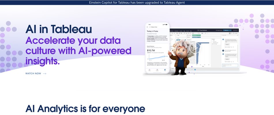 Tableau AI, Tableau veri görselleştirme platformunun önemli bir parçasıdır. İçgörüleri geliştirmek ve karar verme sürecine yardımcı olmak için makine öğrenimi ve veri analitiğini kullanır. Verilerinizdeki eğilimleri, kalıpları ve anormallikleri otomatik olarak keşfederek kullanıcıların kritik iş faktörlerini hızlı bir şekilde belirlemelerine ve genel performansı iyileştirmelerine olanak tanır.