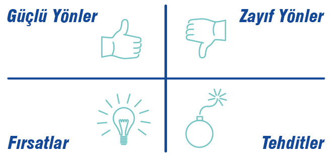Bu güçlü ve zayıf yanların tanımlanması, bekleyen fırsatların ve tehditlerin analiz edilmesini de sağlar. SWOT analizi, bu tanımlamaları yapmak için en uygun tekniklerden birisidir. SWOT’u özellikle güçlü kılan, düşünce akışı içinde önceden fark etmediğiniz fırsatları ve tehditleri görebilmenizi sağlamasıdır. Zayıf yönlerinizi anladığınızda ilerlemenizi engelleme ihtimali olan tehditleri yönetebilir ve ortadan kaldırabilirsiniz.
