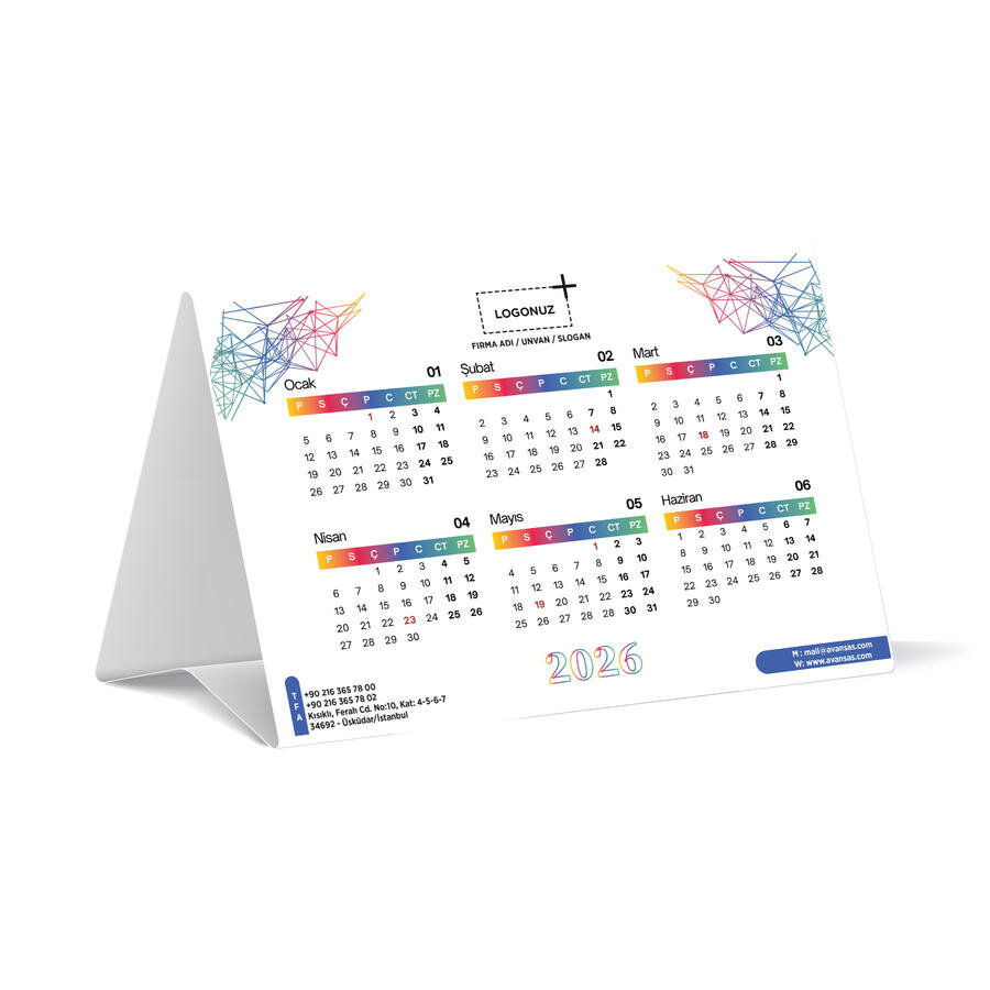 Üçgen masa takvimleri görsellerle süslenmiş tasarımı daha ön planda olan şık takvim modelleri arasında yer alır. Özel tasarım modellere firmanızın bilgilerini ekleyebilirsiniz. Promosyon ürün olarak dağıtabileceğiniz bu takvimler sayesinde, markanız sürekli olarak göz önünde olacaktır.